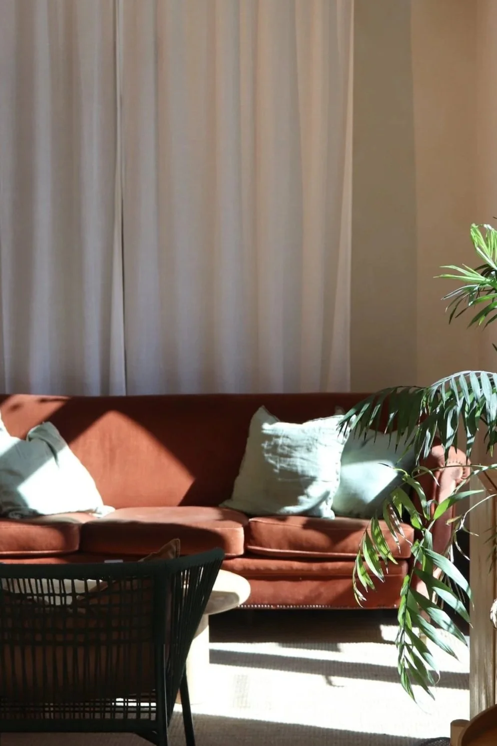 A luz atravessa as cortinas e a madeira ganha outra cor.